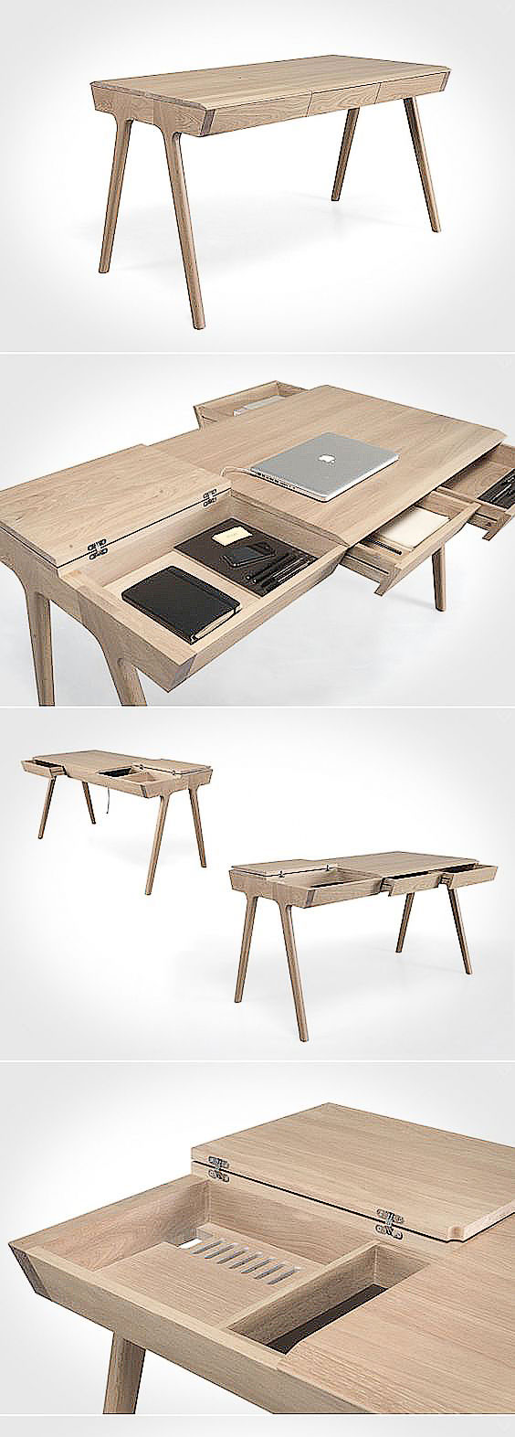 Также стол может быть оборудован специальными подставками для мыши и клавиатуры, которые можно отодвигать в сторону. Существуют и держатели для проводов, а столешница оснащена отверстиями для них. Есть модели, где под столешницей располагаются скрытые ящики, которые закрываются отдельными частями столешницы.