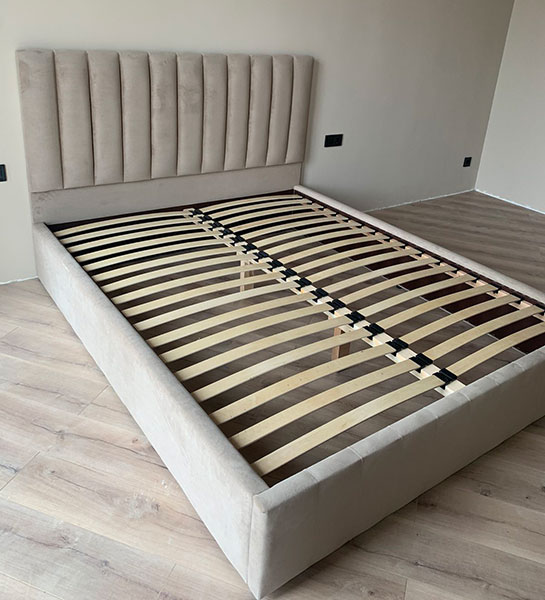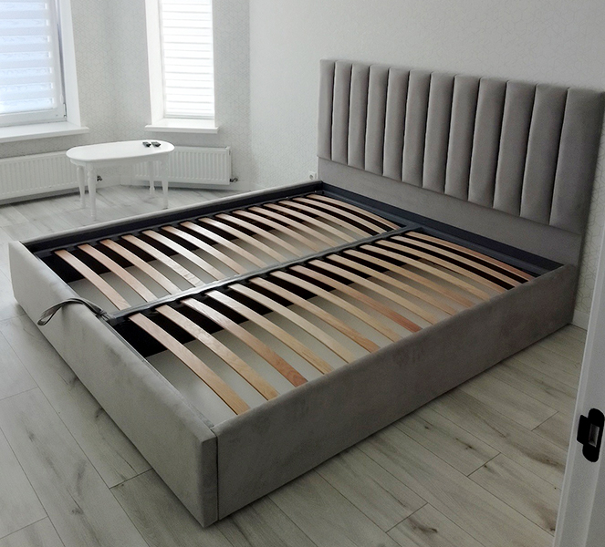 в комплектации с подъемным механизмом в кровати будет идти металлический цельносварной каркас с широкими ламелями, которые встроены в сам каркас, благодаря чему ламели не выпадают;