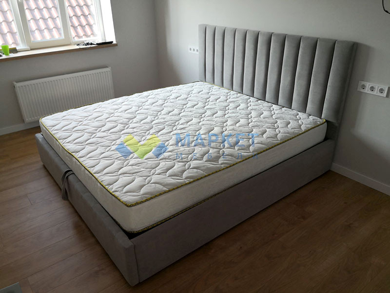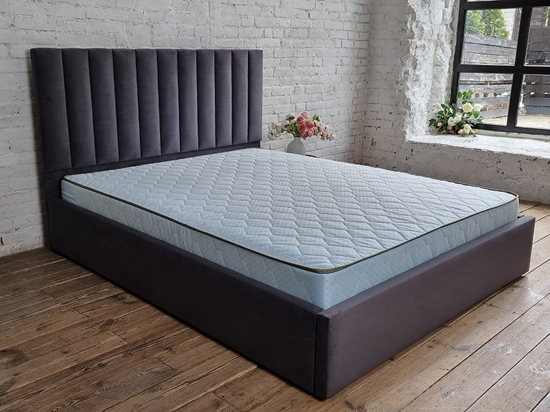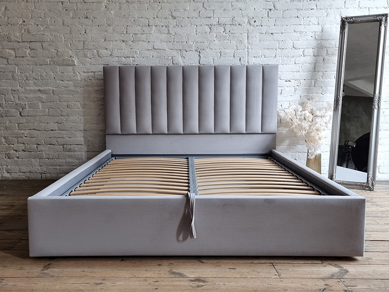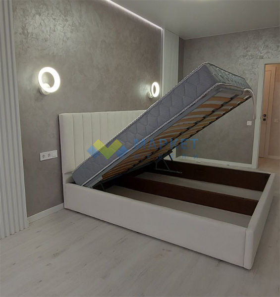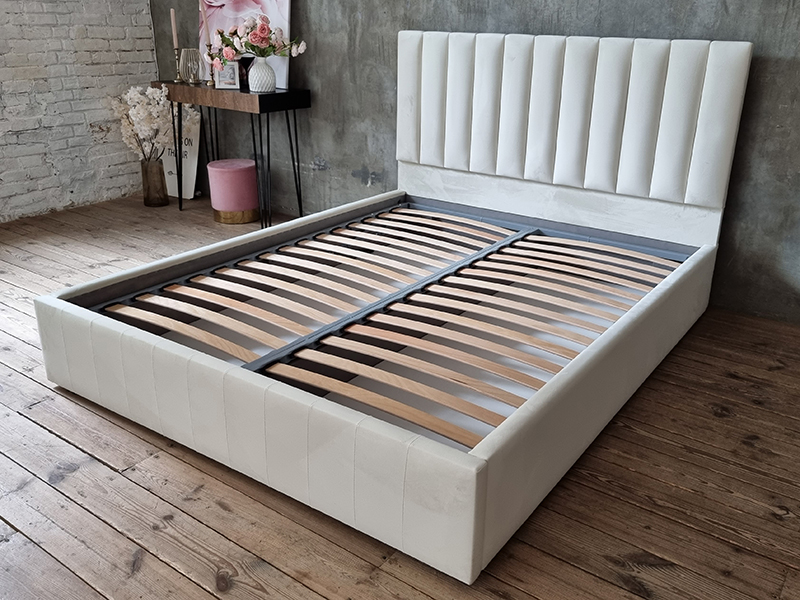 в комплектации с подъемным механизмом в кровати будет идти металлический цельносварной каркас с широкими ламелями, которые встроены в сам каркас, благодаря чему ламели не выпадают;