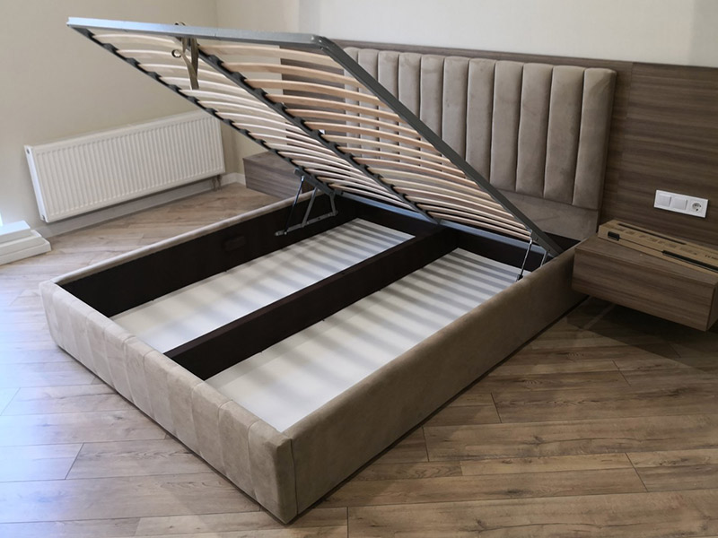к кровати можно добавить подъемный механизм, оснащенный надежным газлифтом, выдерживающим 1200-1500 Н. За счет плавности хода механизма, даже дети смогут поднять каркас с матрасом без особых усилий и травм;