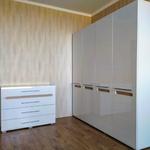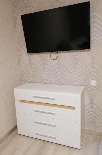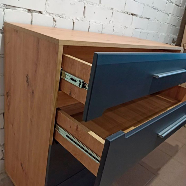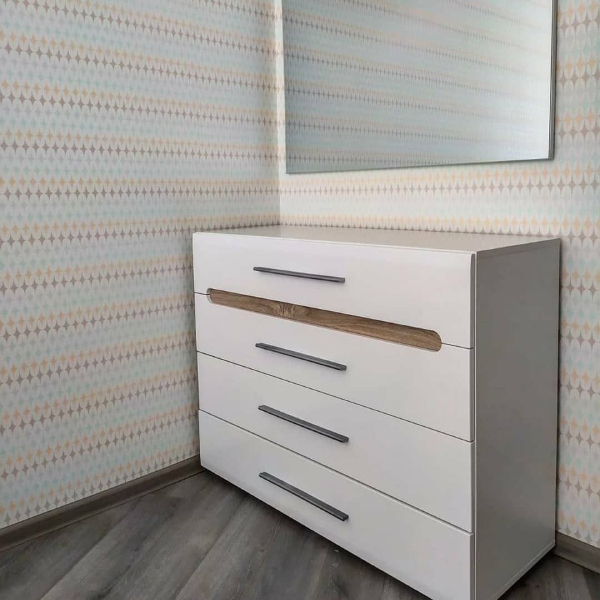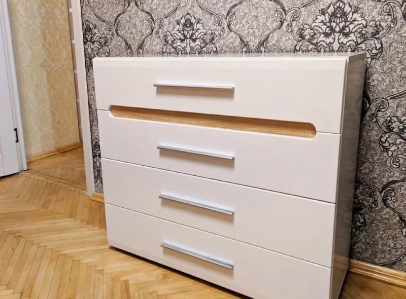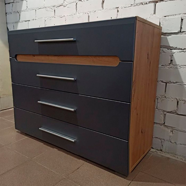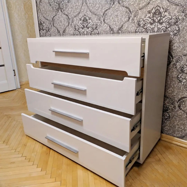 Комод КВ-4 имеет 4 выдвижных ящика на направляющих полного выдвижения. Фасад и корпус данного комода изготовлены из специального сертифицированного мебельного ДСП.