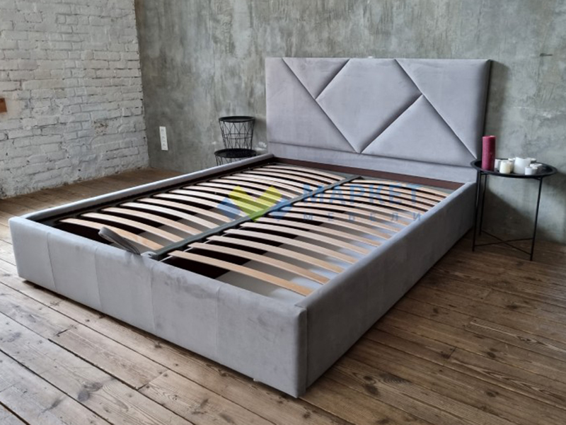 в комплектации с подъемным механизмом в кровати будет идти металлический цельносварной каркас с широкими ламелями, которые встроены в сам каркас, благодаря чему ламели не выпадают;
